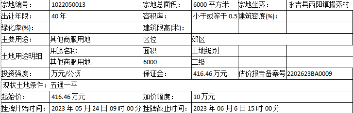 1022050013 号地块:2023年05月24日09时00分 至 2023年06月06日15时00分 ;